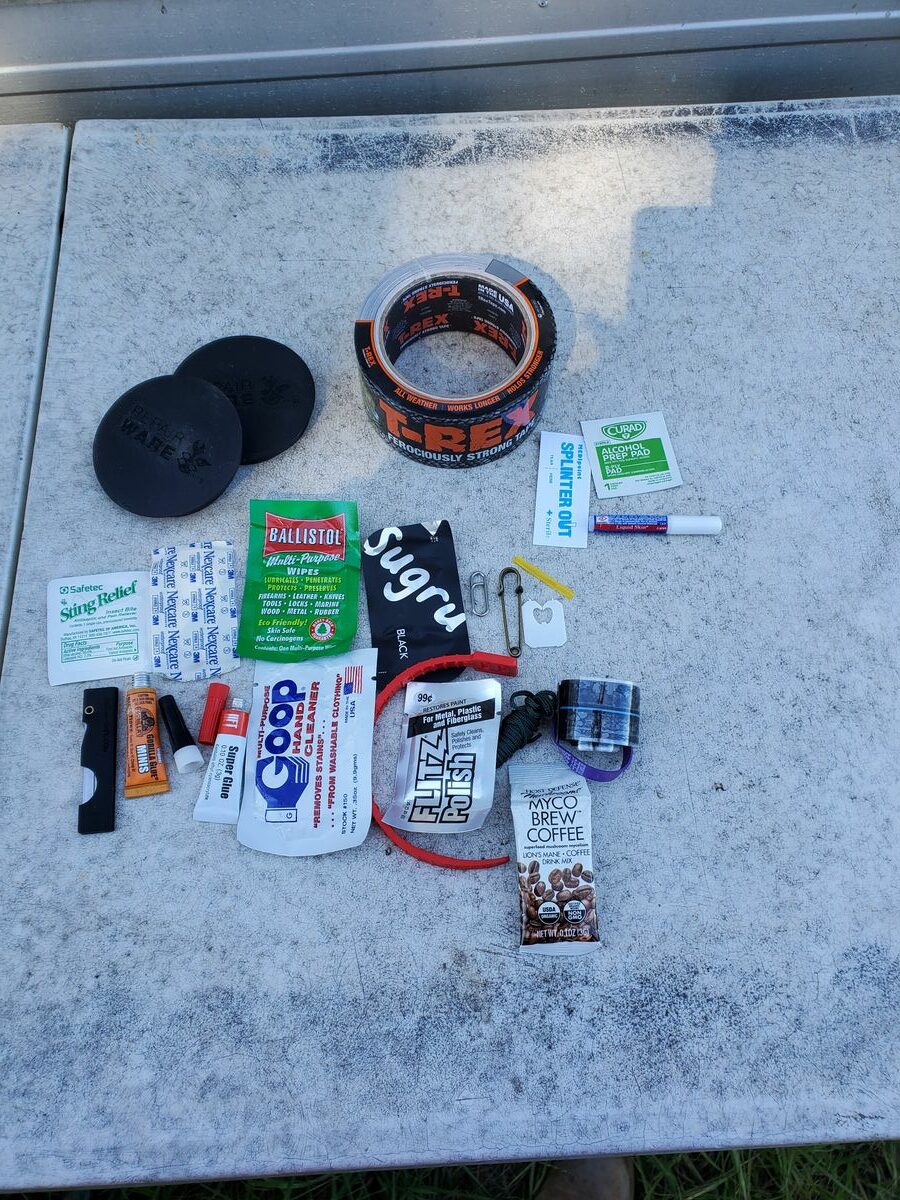 Universal Accessory Kit V1 TREX TAPE :1- 10yd Roll of TREX Tape with RepairWare Lids, 1 – Sugru – Black1 – Flitz Polish Packet, 1 – OAK All in one Toothpick, 1 – Derma-Safe knife, 1 – Goop Hand Cleaner Packet, 1 – Safetec Sting Relief Wipe,1 – Myco Brew Coffee, 1 – Super Glue, 1 – Gorilla Glue mini, 1 – Ballistol Wipe.1 – 15″ roll of silicone tape with rubber band1 – small hank of cordage1 – bread clip1 – twist tie1 – bushcraft safety pin1 – 100lb Paperclip